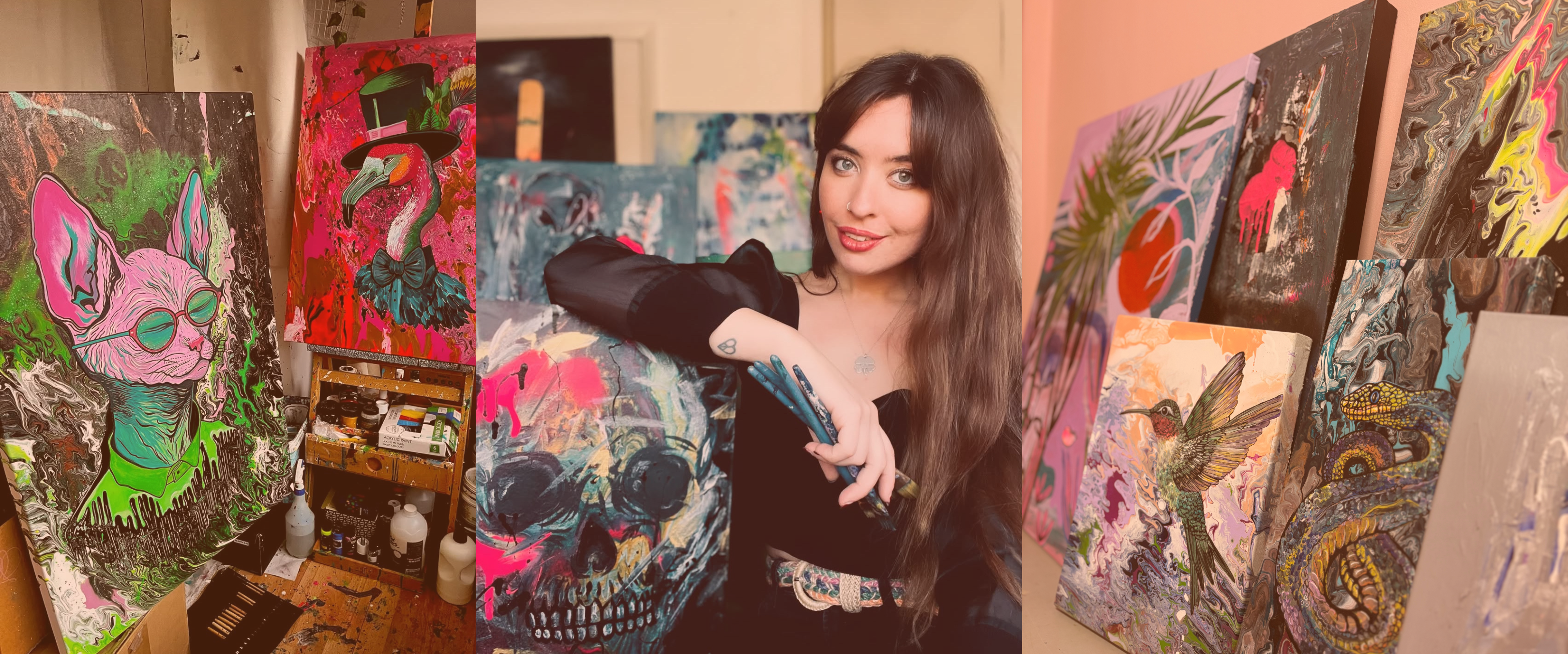 My mixed media paintings are full of layers, depth and texture. I love using a mix of acrylics, pastels, fine liner, chalk, spray paint, and whatever else I find in my studio to bring each piece to life. My main focus is animals and nature, mixed with bright colours and expressive patterns that make each painting joyful and full of character.